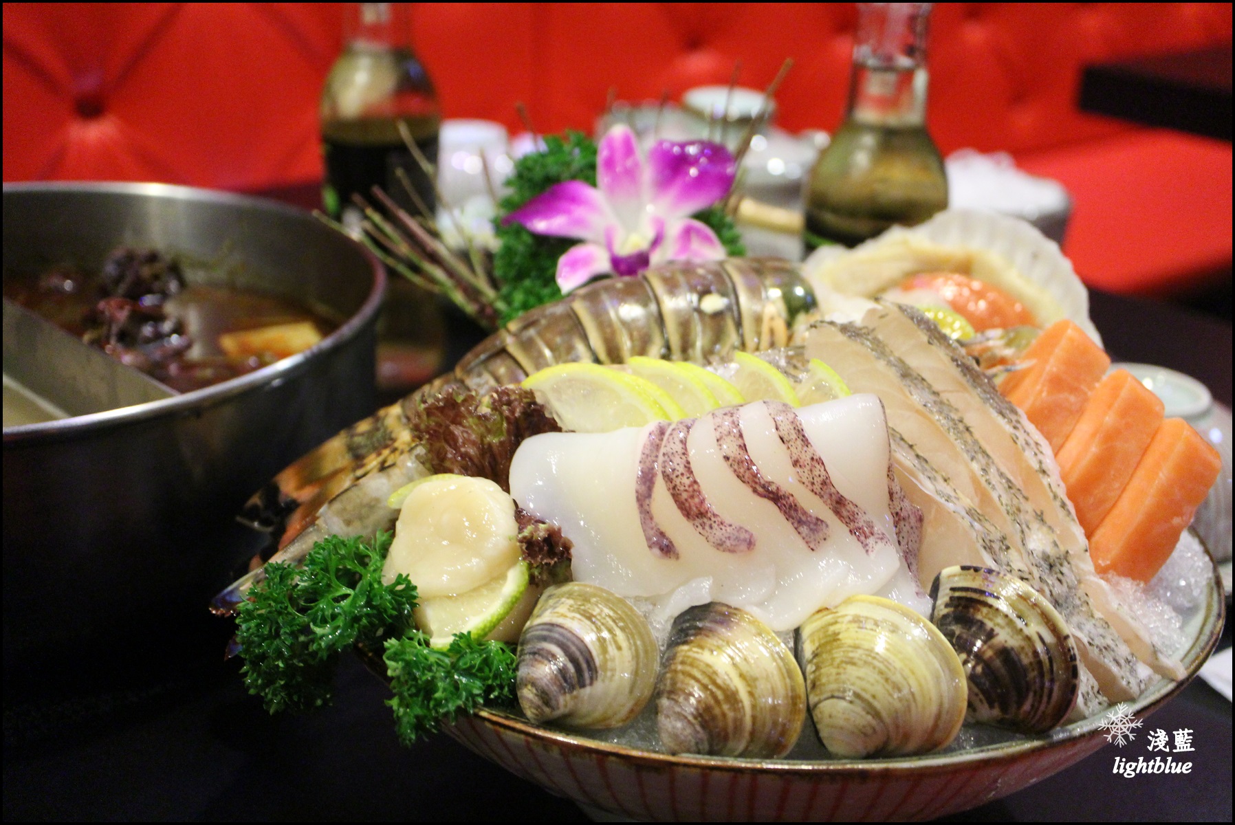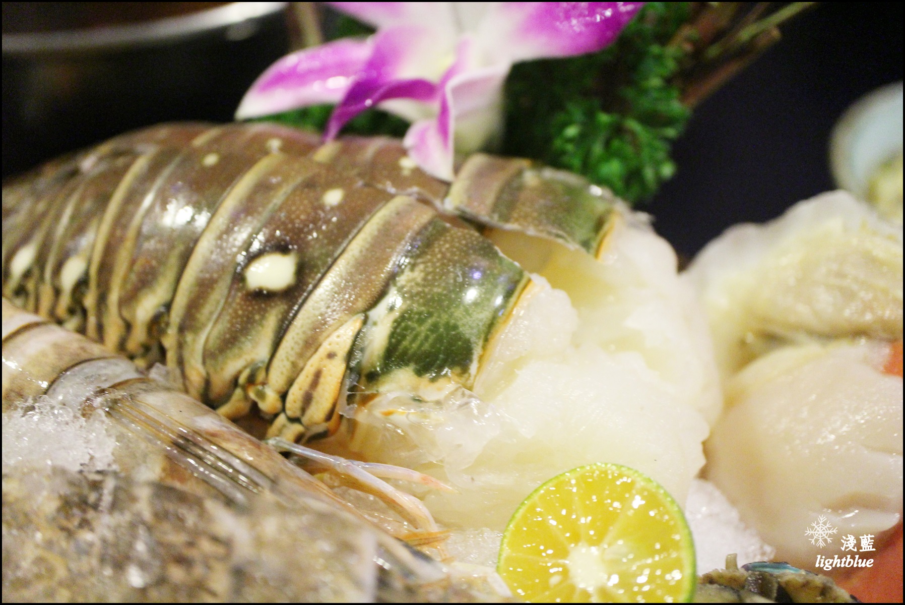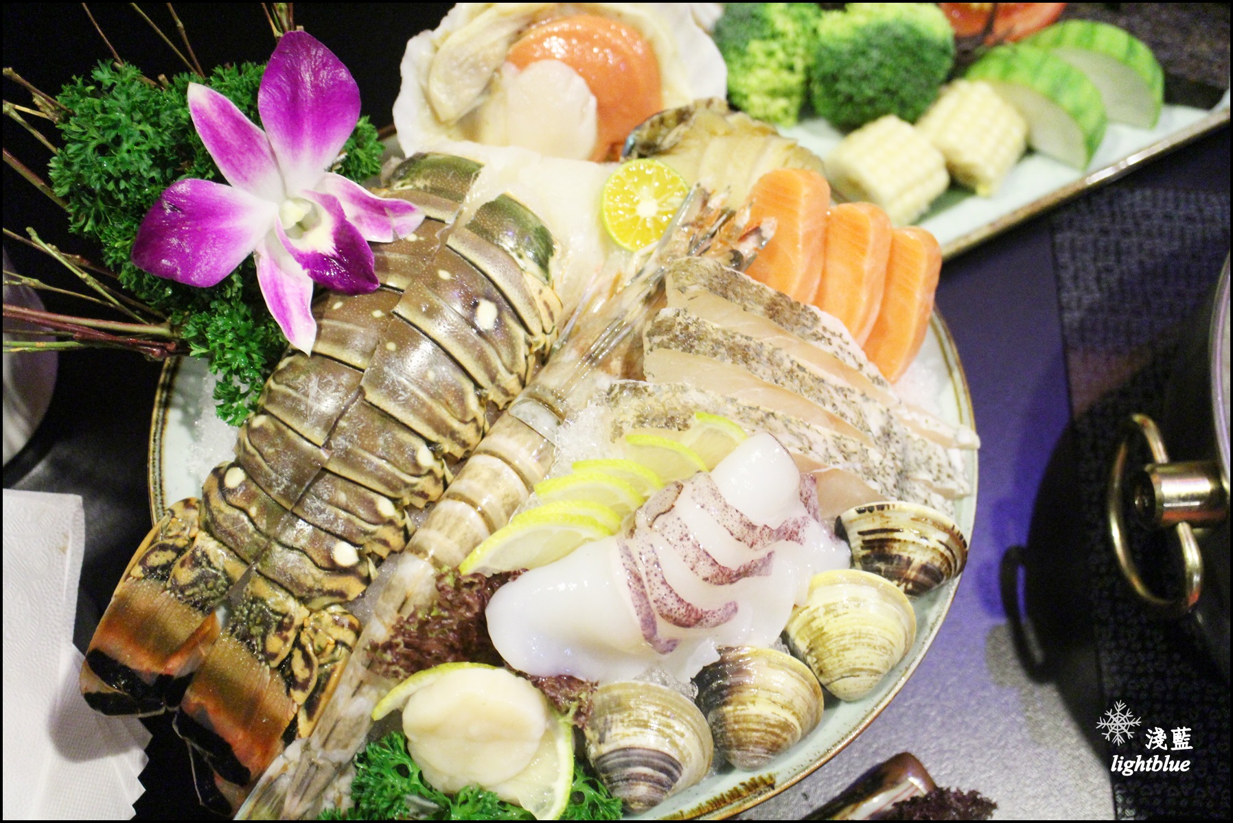 可以看到有石斑魚、鮑魚、鮭魚、干貝、軟絲、扇貝、蛤蜊跟兩大主角:波士頓龍蝦身跟澎湖大明蝦,擺盤也是豐盛又典雅