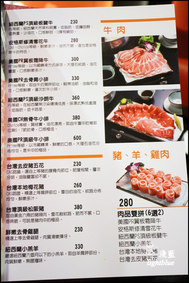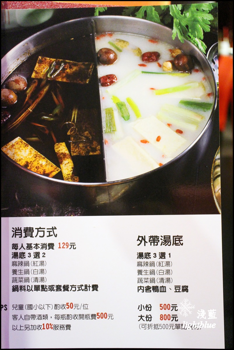 不過打開菜單仔細端詳,才發現其實點菜方式很多樣,沒有一定要兩個人綁在一起啦。每個人低消是鍋底129元,鍋底有麻辣鍋、養生鍋、蔬菜鍋三選二,鍋料可以選擇套餐或者單點