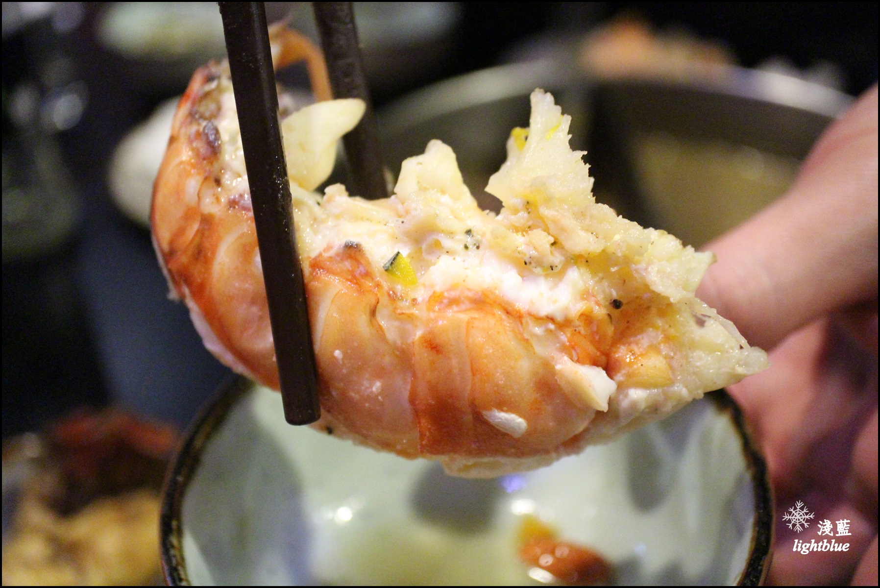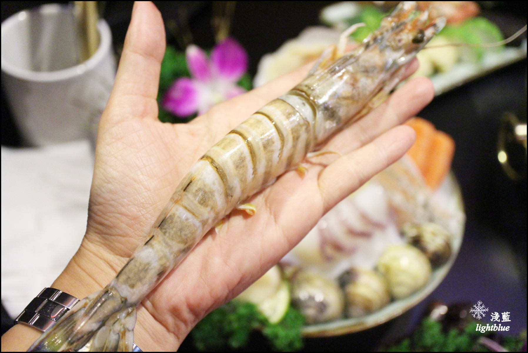 忍不住拿起澎湖大明蝦來比劃一下,比我的手掌心還要長呢,燙熟之後也不縮水,又Q又彈好鮮甜,如果想要掐比較緊的預算,點大明蝦也是好選擇喔