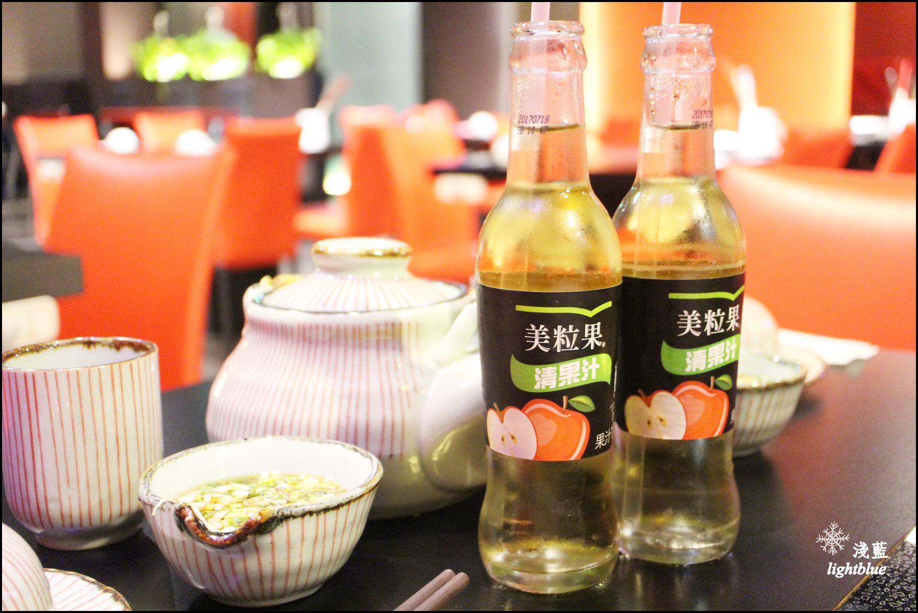 店內店內座位不少,雖然在地下室不過天花板很高,不會有壓迫感,裝潢以黑紅雙色為主,很有鴛鴦鍋的感覺。無限供應的茶水是直接給一壺,覺得一整套的和風茶具好有質感啊~飲料另有汽水或蘋果汁,我選了蘋果汁,送上的是玻璃瓶裝的美麗果