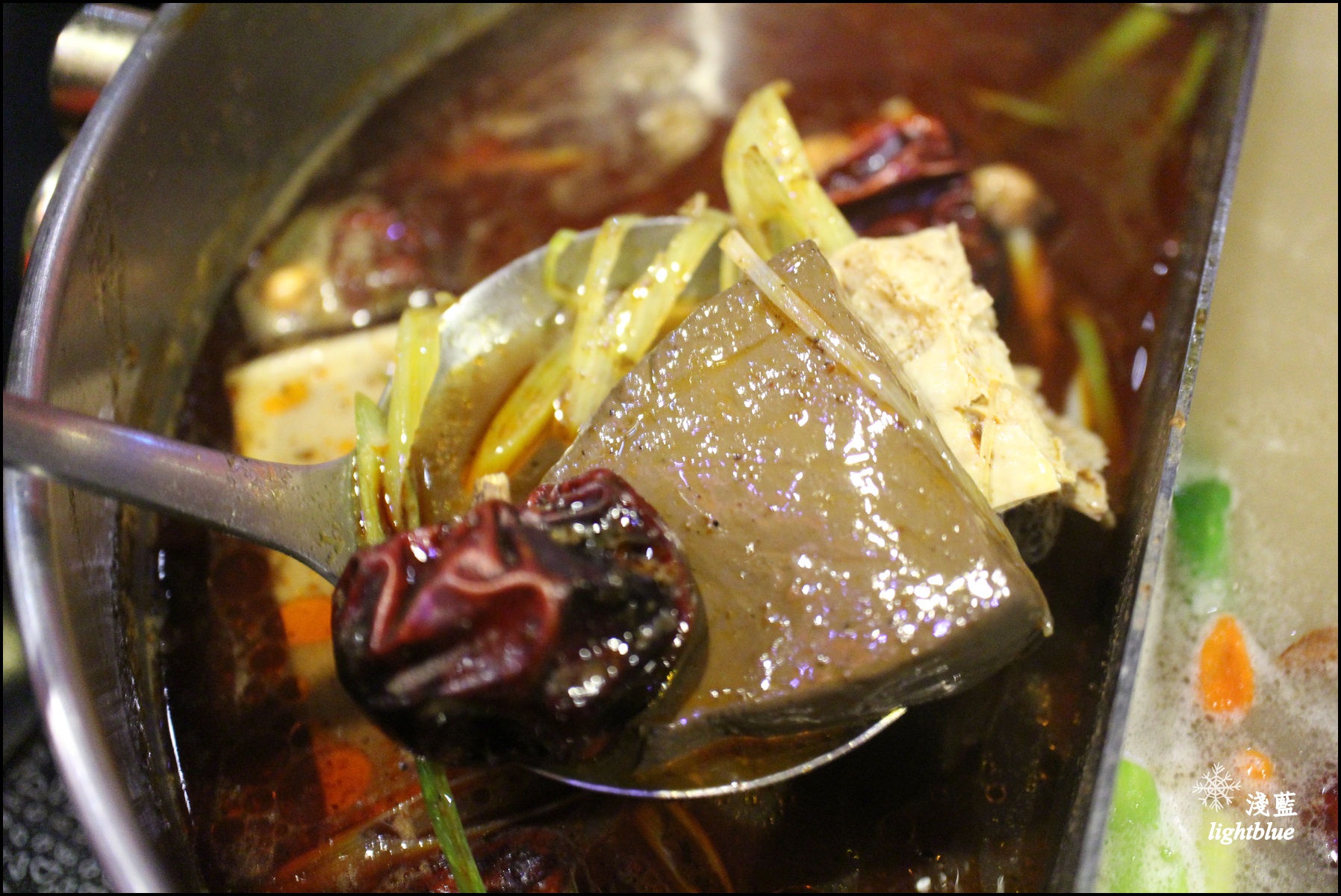 另一邊當然選麻辣湯底啦,店家使用十餘種中藥去炒香之後熬煮,基本都是從微辣起跳,我一般吃小辣,真的就覺得只有一點點小辣度,所以平常有在吃辣的人點餐時可以直接從小辣起跳然後慢慢調整辣度。麻辣鍋底的豆腐鴨血一樣可以無限續,且是服務人員幫忙加湯時都會主動問要不要加豆腐鴨血,我當天續了大概有三次,他們家的豆腐鴨血都好順口啊
