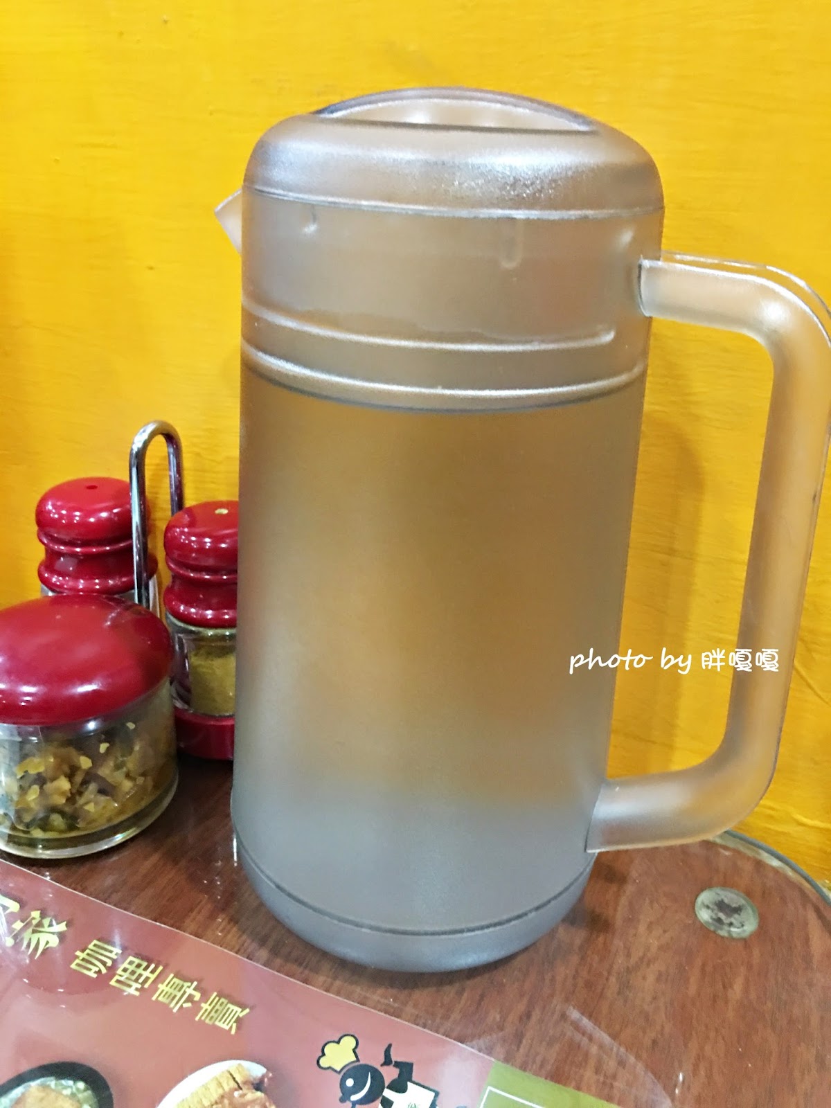 桌旁有放水和調味料