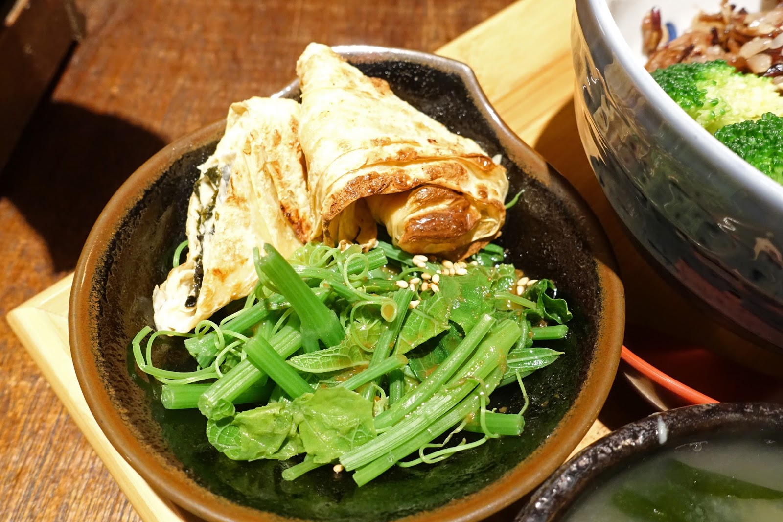 配菜除了花椰菜,還有一碟龍鬚菜與豆腐皮捲,豆腐皮捲著海苔煎得酥香好吃,附湯則是味噌口味的紅白蘿蔔海帶湯,熱騰騰的上桌,喝起來覺得有一股暖意流進心底。