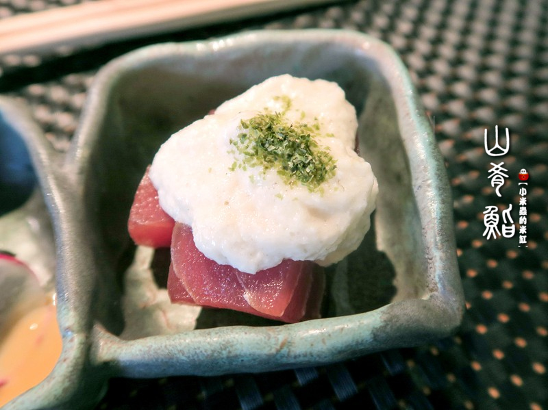 ▽使用台東的「大目鮪魚」口感比較緊實清爽,會先以日式醬油與山葵醃過,搭配的日本大和芋口感像麻糬一樣Q滑黏稠,滑滑的口感讓人很驚艷耶!!