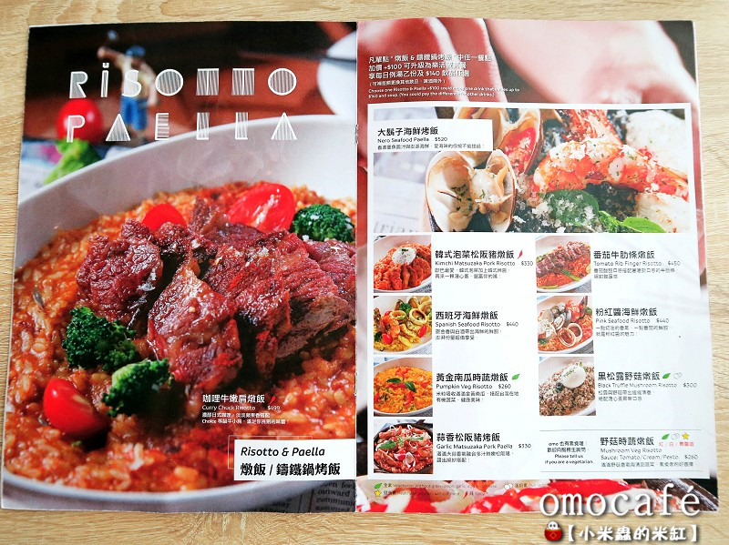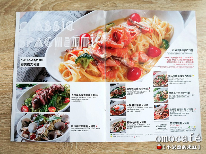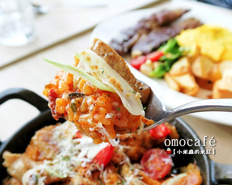 【omocafe】主要提供開胃下酒菜、份量十足的沙拉、全日早午餐系列、經典的義大利麵&燉飯、手工甜點、餐酒與飲品等