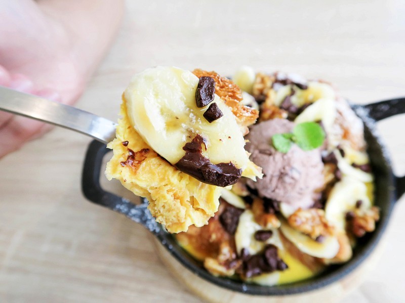 可頌麵包切片注入布丁液至鑄鐵鍋烘烤,再擺上了新鮮的香蕉切片與巧克力冰淇淋