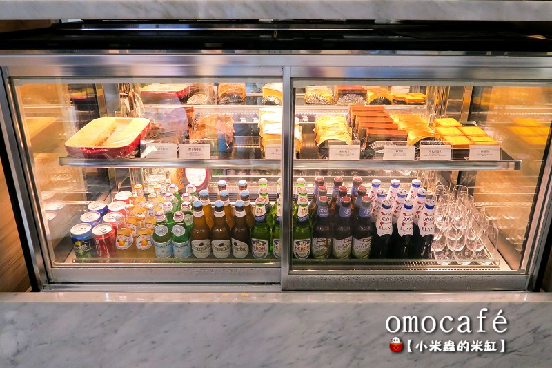 冷藏櫃裡呈列著一個個精緻可口的甜點與氣泡飲料~