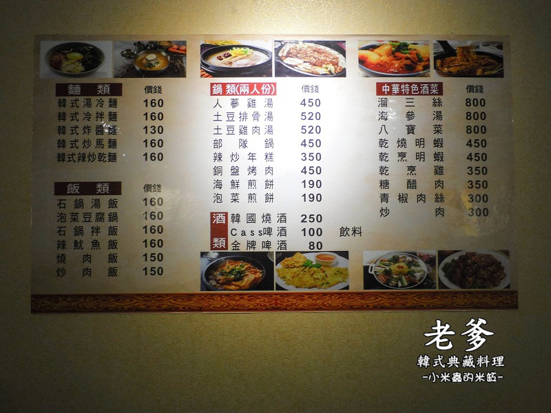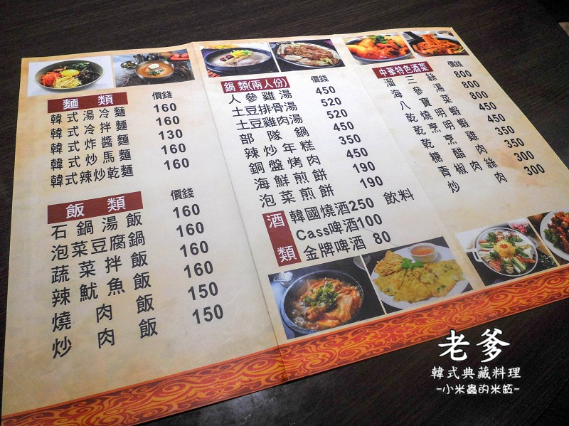 菜單有韓式麵類、飯類、鍋類還有中華特色餐點