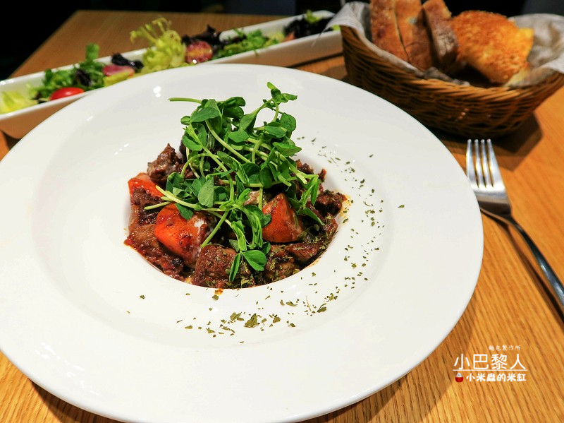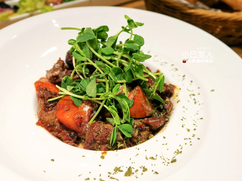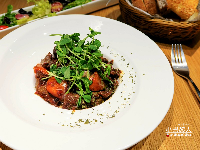 法式紅酒燉牛肉的分量看起來不少,牛肉煮的軟嫩入味,微酸的番茄醬汁裡帶著紅酒的香氣,滋味很是清爽~
