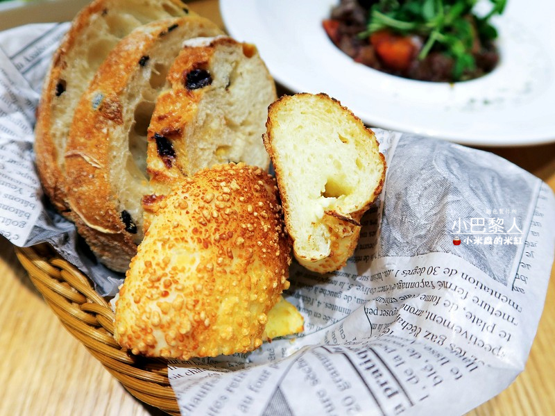 套餐所提供的麵包籃,有店內人氣麵包切片,如:義式黑橄欖麵包、黃金亞麻子蔓越莓麵包等