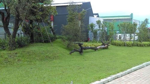 進來工廠會看到一片草皮加上一個木頭裝置藝術~