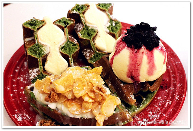 鬆餅本身氣孔較多吃起來口感偏Q有嚼勁,鬆餅抹茶味還算濃厚微苦,搭配香草甜度剛剛好很不錯