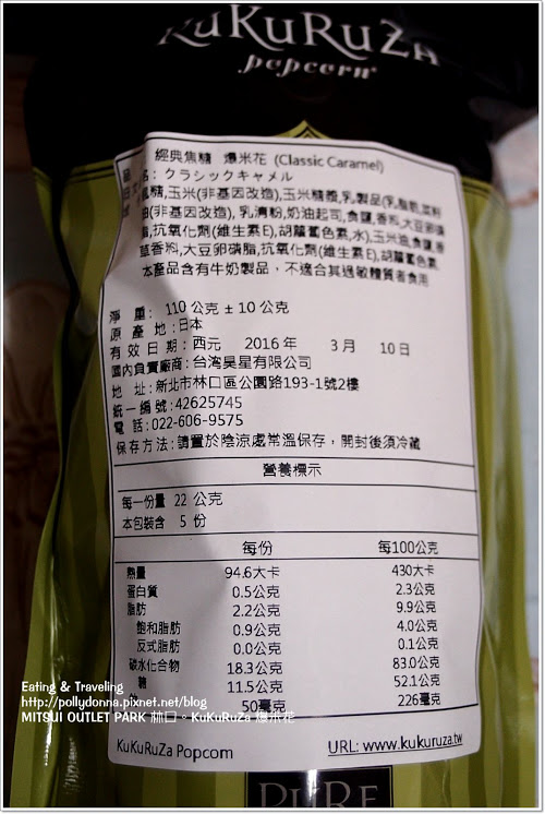 先開經典焦糖來試試。成份和熱量標示包裝袋背面有貼,爆米花熱量真的好高>///<。