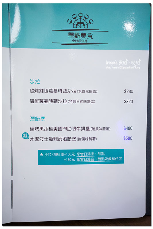 套餐包含;主餐、沙拉、手工麵包、湯品、甜點、飲料。