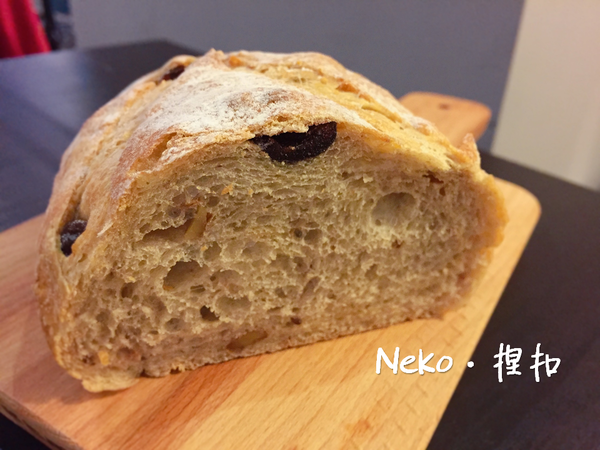 很紮實的酵母香味,裡面有酸甜的酒漬葡萄乾及蔓越莓,核桃也很香酥新鮮,適合喜歡有咬勁的歐式麵包的人