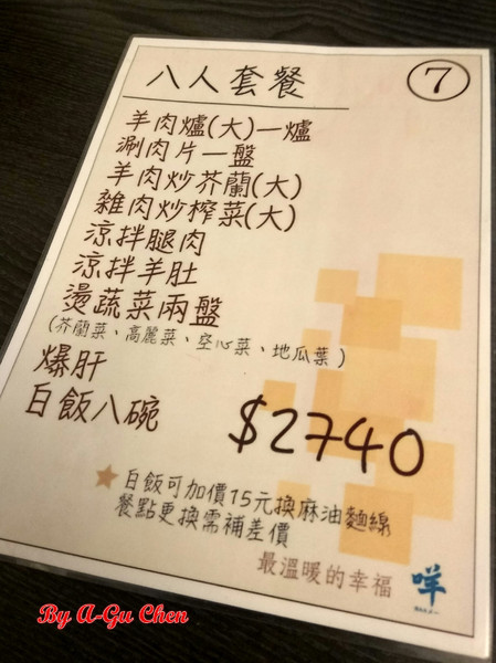 若面對菜單上琳瑯滿目的品項真的不知如何作選擇,也可以參考店家設計的套餐,其價位平均下來每人約三百到四百元,有白飯、有青菜、有炒羊肉,當然還有主打商品羊肉爐囉!其中白飯可加價15元換成麻油麵線。