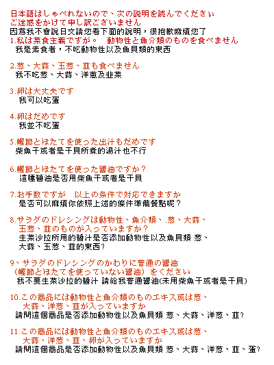 部份精進料理中也含魚的成份,因此如果能準備幾句更詳細的素食相關用語,