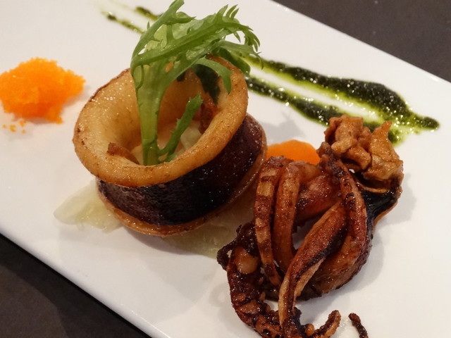 炸得香酥脆口的中卷沾上羅勒醬汁,風味獨特
