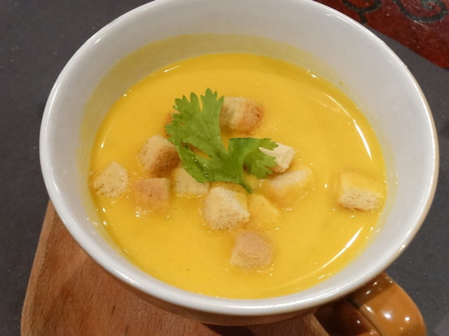 南瓜濃湯,這道湯品南瓜味濃郁香甜,搭配酥香的麵包丁,讓我一口接一口