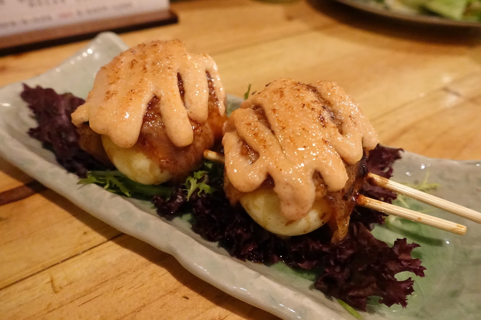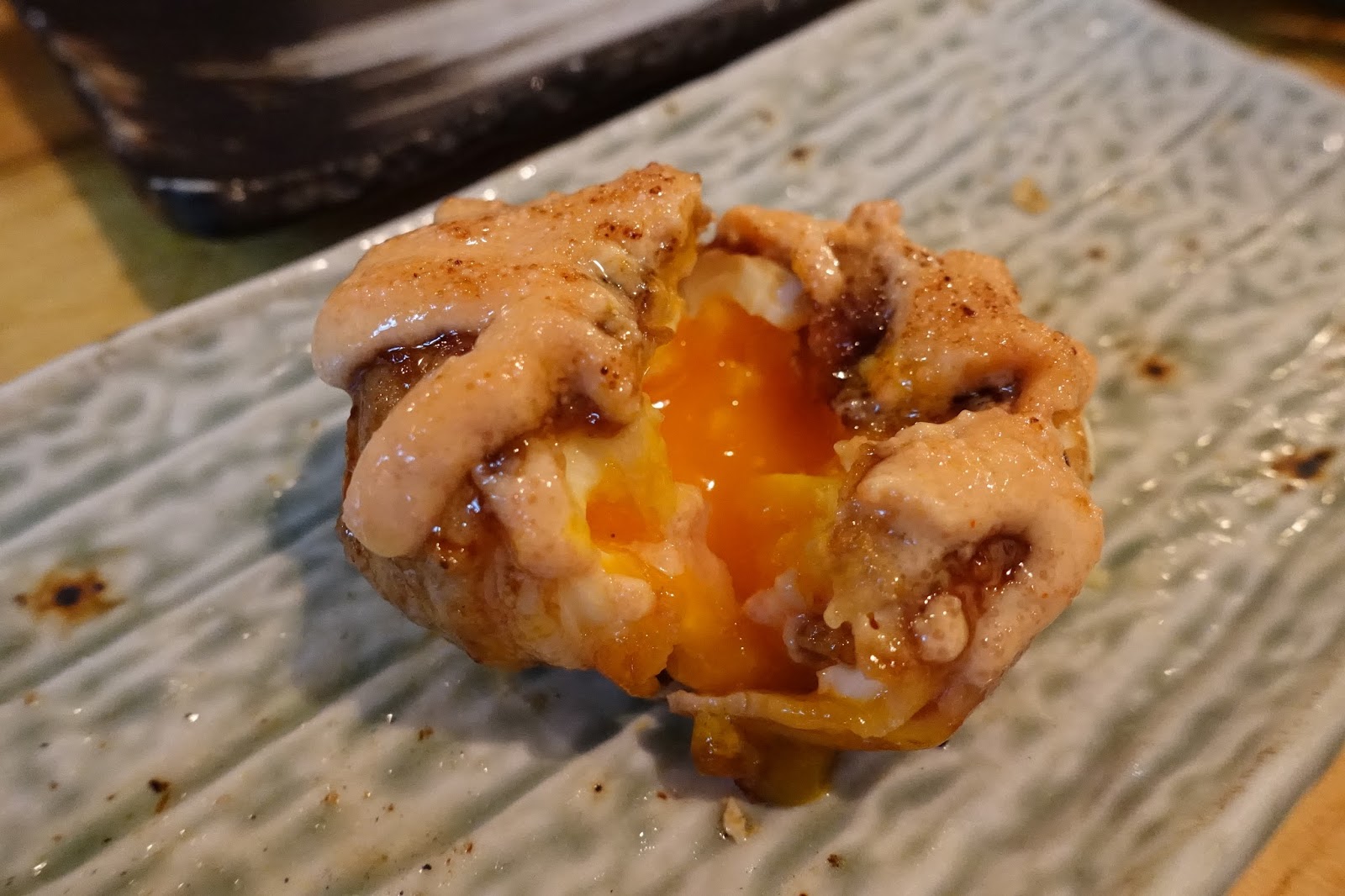 新菜色溏心肉捲,以豬肉捲著溏心蛋去碳烤,過程中浸泡過醬汁續烤,最後淋上明太子醬烤得外酥內軟,看起來已經非常吸引人,切開內層,蛋黃流動的樣貌,更令人垂涎。