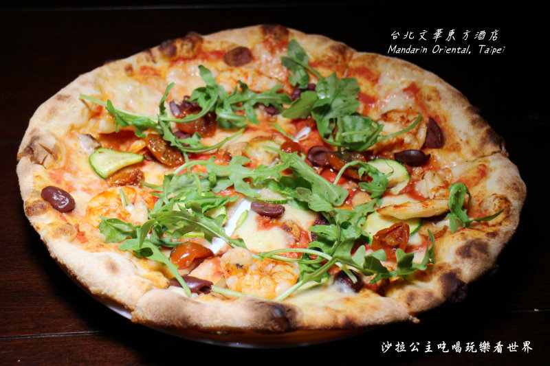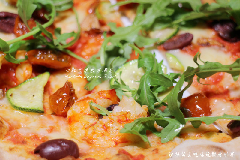 披薩使用了蕃茄醬、莫札瑞拉乳酪、節瓜、風乾蕃茄、鮮蝦、黑橄欖