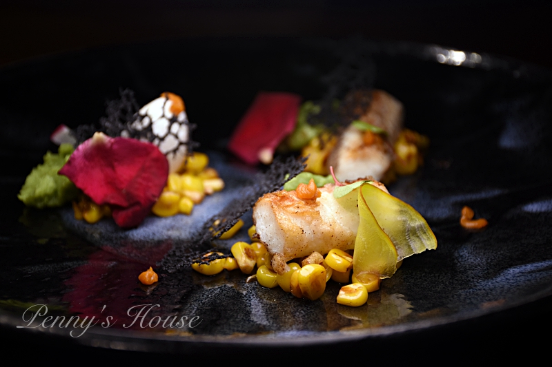 這道菜色其實細節很多,又是青豆泥,又是半熟鵪鶉蛋,另外烤過的玉米粒加上馬鞭魚,