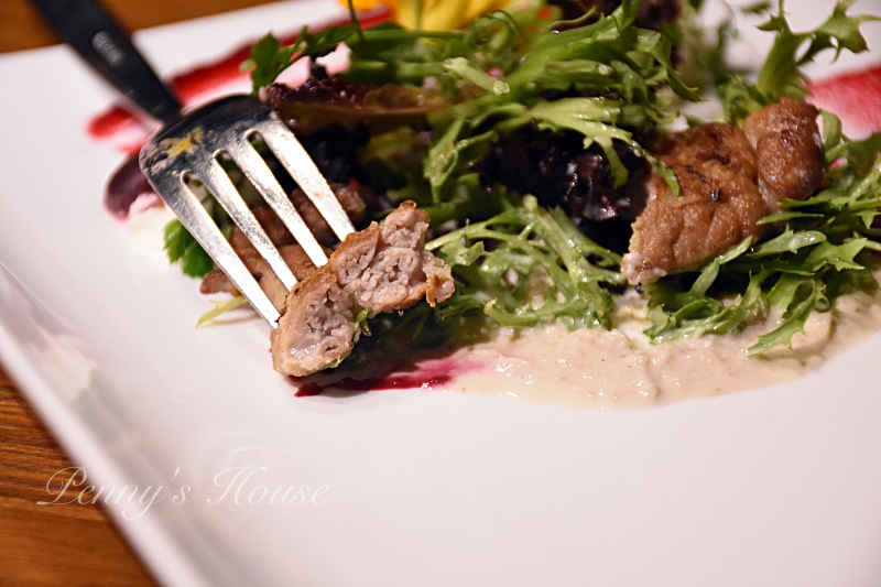 這道小牛核是採用乾煎的方式,搭配沙拉,還有牛蒡醬汁和甜根菜,