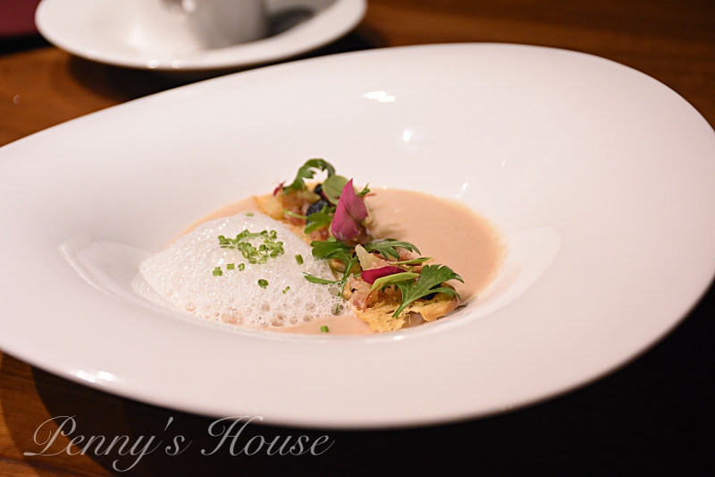 這一道海鮮濃湯味道真的好喝,採用南法料理手法,有點甜椒味、番茄味,