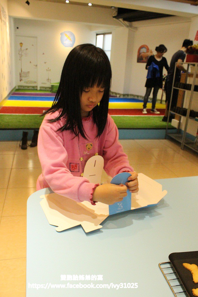 姐姐去拿柒零生手做DIY烘焙的外帶紙盒來折,把等一下烘烤好