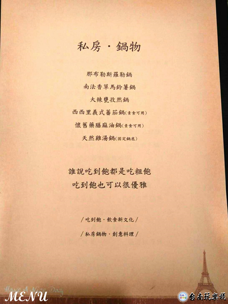 主打:私房鍋物/精緻肉品/buffet/頂級冰品/生啤酒/葡萄酒/調酒/義式咖啡/手調飲品/蜜糖吐司/脆皮鬆餅/法式甜品