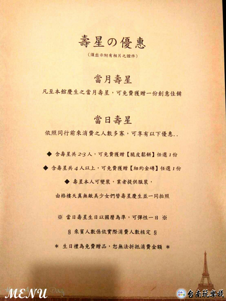 哇!真的太好了~當月壽星還有特殊的創意佳餚優惠,若是6位一起前往,不就有12道創意佳餚可以吃飽飽,所以壽星要好好把握喔。當月壽星的已經這麼嗨了!