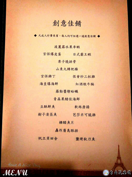 採成人計算,幾個人用餐就可以點幾道特殊的創意佳餚,在近20道佳餚一時之間也陷入難以抉擇的困境,每一個都想吃看看。