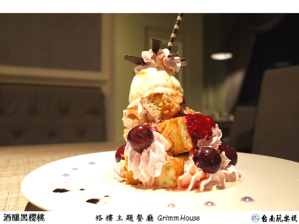 卡士達醬及冰淇淋相互輝映下在緊密的與整理結合,在底部丹麥吐司磚上旁邊淋上綜合莓果醬+黑櫻桃,整個畫面看來美麗的像一座甜點城堡般,若要拍照的盡快喔~美麗時刻可是會稍縱即逝,冰淇淋可是如雪花般融化的,在方磚型底部推疊成塔的蜜糖吐司,任何角度看來都是拍照都不錯也比較美這類甜點個人覺得視覺效果大於味覺體驗。