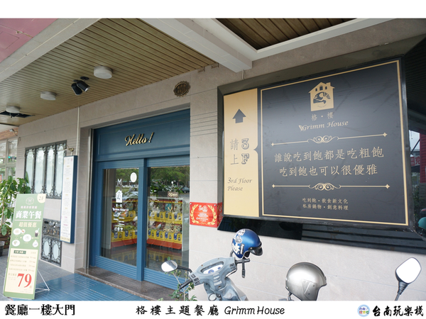 位於市政府旁怡平路與建平路口的小七樓上,開了一間吃到飽餐聽,斗大的標題寫著『誰說吃到飽都是吃粗飽,吃到飽也可以很優雅』短短的二行字讓我產生了強烈的好奇心,吃到飽該如何吃得很優雅呢。在好奇心的驅使下,心動不如行動,就讓我來為大家介紹一下,這間餐廳是「格林洋房餐飲」籌備已久的新型態餐廳,以【格樓】為主題,標榜的是讓你可以優雅吃到飽,看來可能又會在台南引起一波新的風潮了。格樓的店員都穿著女僕制服,還有一位很帥氣的黑執事,應答的態度非常親切,女僕我常常看到,但是黑執事就完全沒有看過了,吃到飽又配上女僕,還標榜是可以優雅吃到飽的主題餐廳,講到這裡,你心動了吧!一起來看看到底葫蘆裡賣什麼藥吧!
