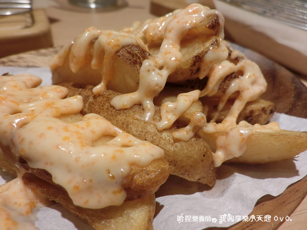 特製的明太子沙拉醬搭配香酥脆薯,它的薯條是整顆馬鈴薯連皮下去炸的,表面酥脆裡面卻是鬆鬆軟軟的馬鈴薯泥,份量上又不會太多,還沒適合當點心的!