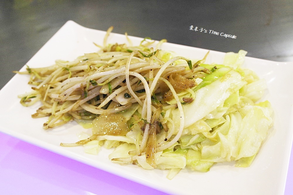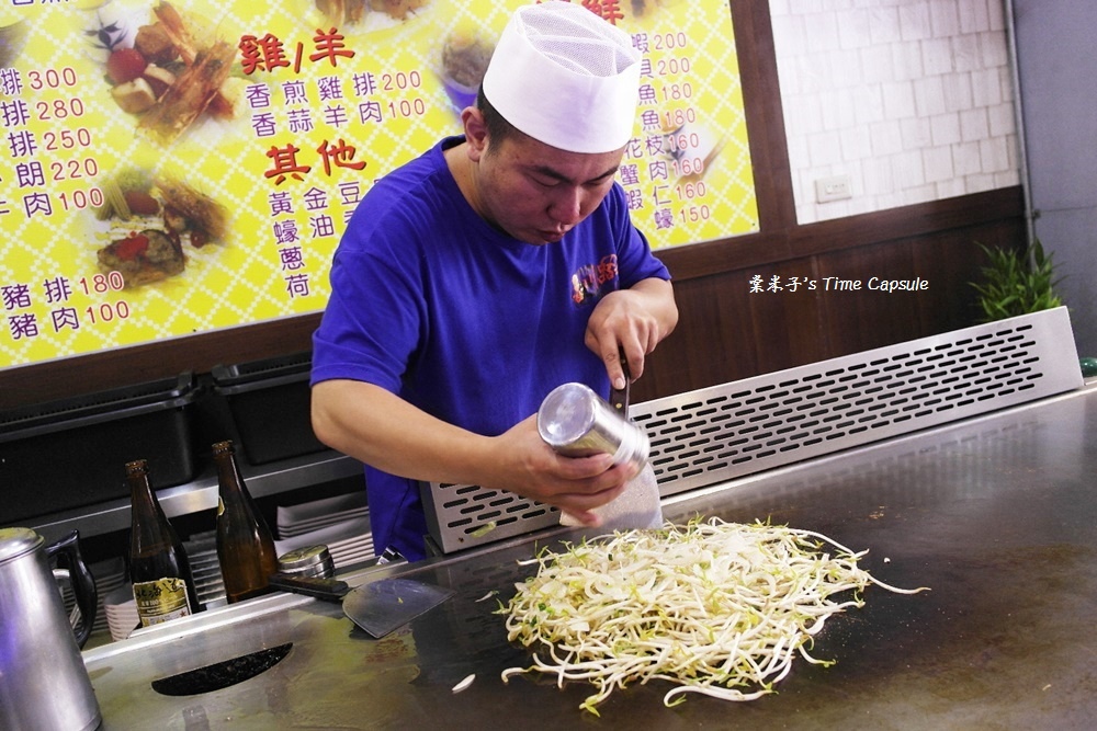 4人份的高麗菜和豆芽菜一起在鐵板上翻炒著,