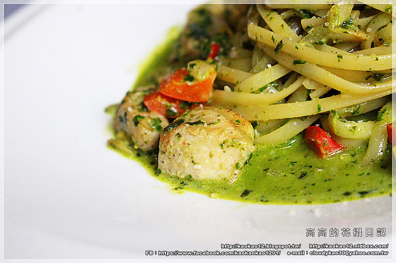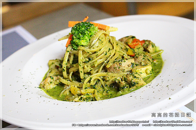 《松子羅勒青醬六白里肌義大利麵,250元》