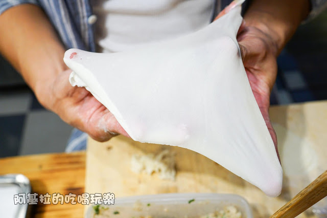 ▲這太誇張了,包水餃的餅皮居然可以拉開到這種程度,老闆說以他的標準,餅皮的彈性要可以拉到比手掌大,要可以呈現半透明的才算合格,由此可知,煎餃吃起來一定很有彈性。