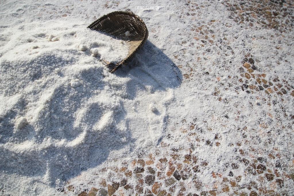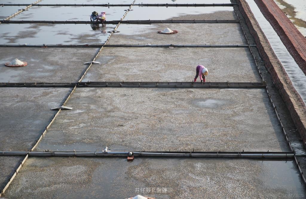 將鹽度達至一定程度的液體 經由水道送入一畦畦的蒸發池之中 經由曝曬 取得雪白的結晶