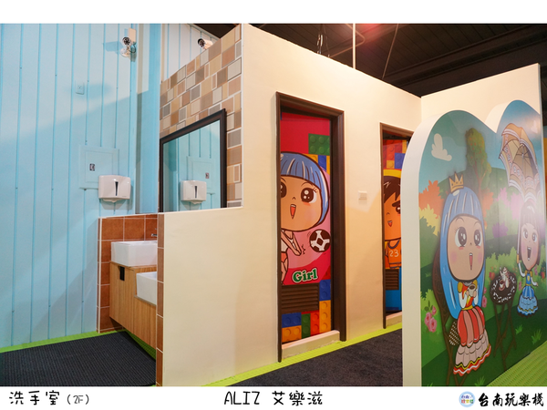 2樓的洗手室也很用心的設計,每一個門口都有大型輸出的海報貼著男女造型的可愛卡通圖案。可別跑錯間了喔。