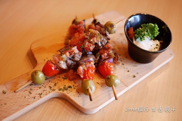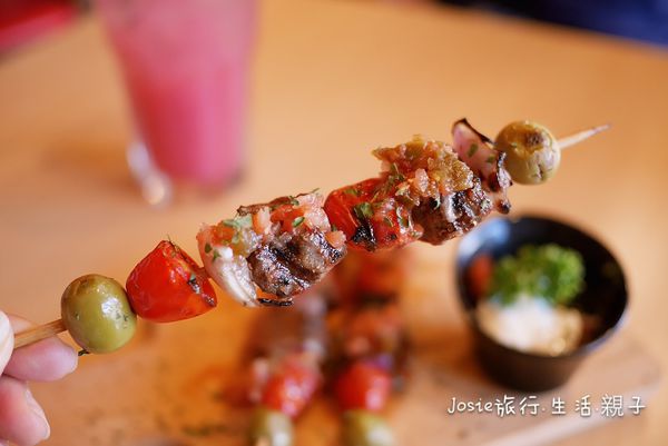以牛肉塊、洋蔥、綠橄欖和小蕃茄串在一塊,
