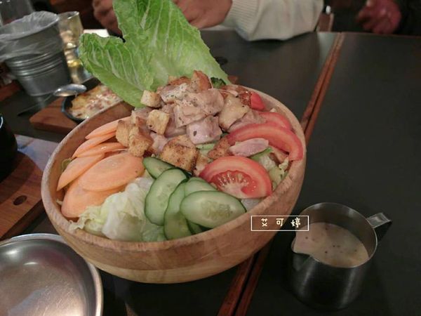 整個就超大碗的,上面塞滿滿的烤雞肉、小黃瓜、番茄、紅蘿蔔、生菜等...,旁邊還有附凱薩醬