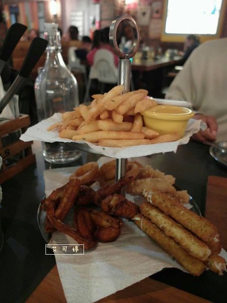 5、歡樂拼盤 Bistro Platter 含墨西哥辣味雞翅、酥炸墨魚圈、墨西哥辣椒片、黃金薯條、洋蔥圈
