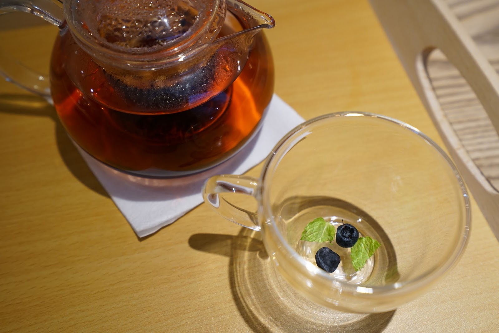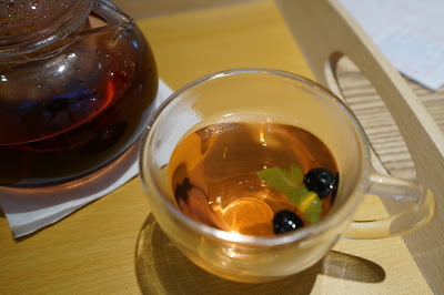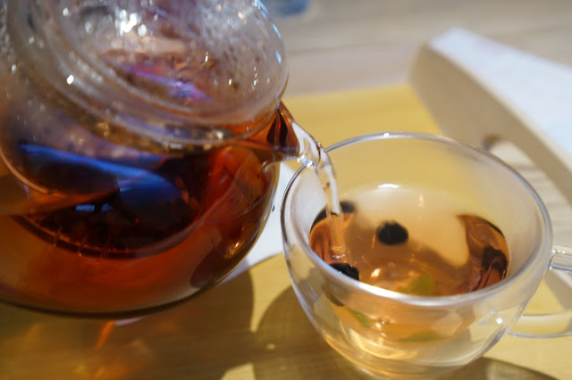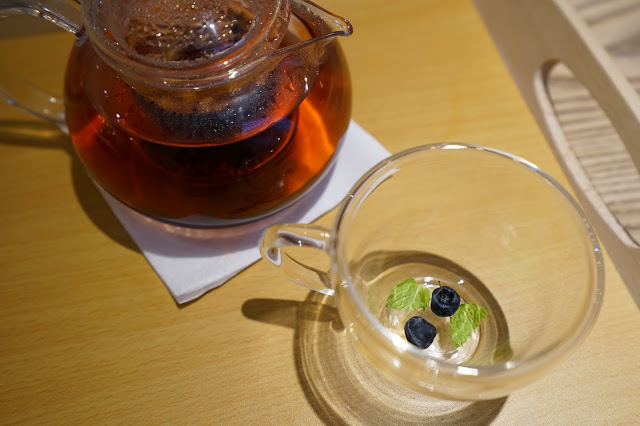 這裡的水果茶也非常的輕盈健康,是用乾果粒去泡的,杯子裡事先放入的藍莓與薄荷葉,更顯得這杯水果茶細緻講究。