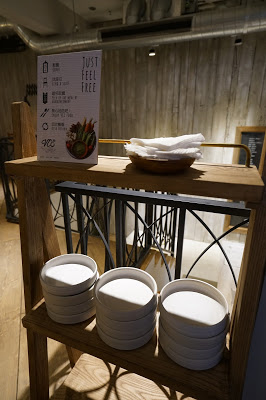 角落提供空的餐盤,讓人方便分食,半自助式的服務,等出餐櫃檯叫到你的名字,再自行取餐,沒有低消限制,而且餐飲價格不再外加服務費。