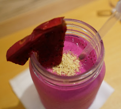 餐廳內的食物以健康為取向,使用很多水果、生菜,餐點選擇不少,有漢堡、三明治、優格、生菜沙拉等,由於才剛吃過飯,就簡單點了杯果昔來喝,一喝之下驚為天人,以火龍果為主角的果昔,顏色鮮豔華麗,還添加了香蕉,喝起來口感非常濃醇、健康,下次絕對還會想再來。