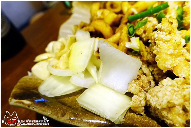 吃膩的純鹽酥雞的口味,可以配著洋蔥和蒜片品嚐,感覺更清新了