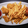 哇!一個盤子上裝了沙拉、薯條、餐包和主餐,很豐富呢!