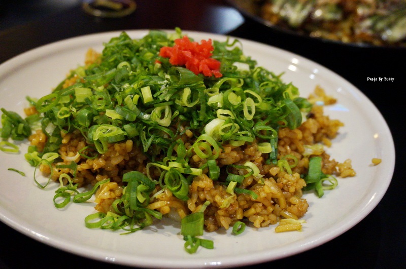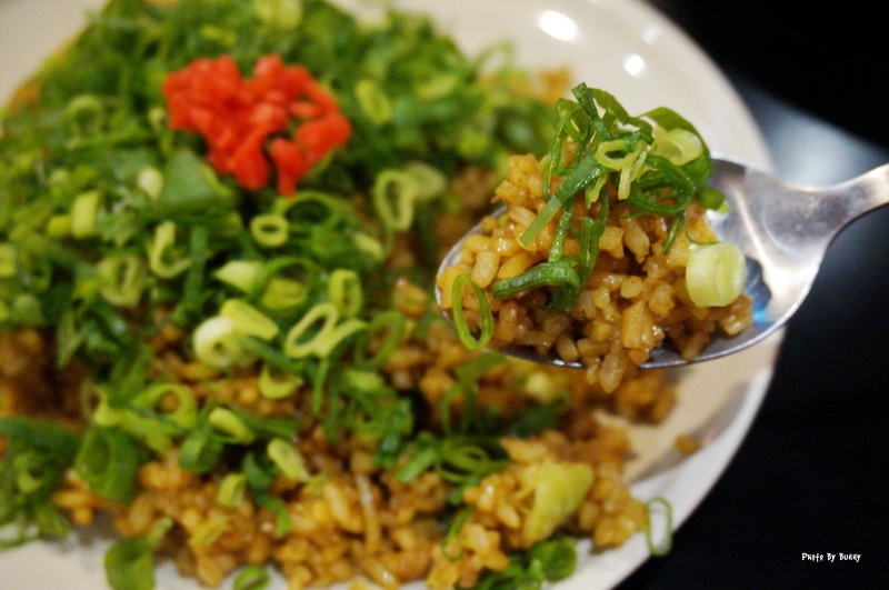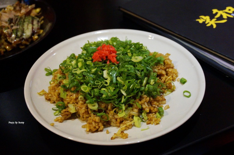 將炒麵切碎後與飯拌炒後上頭佈滿青蔥及日本紅薑