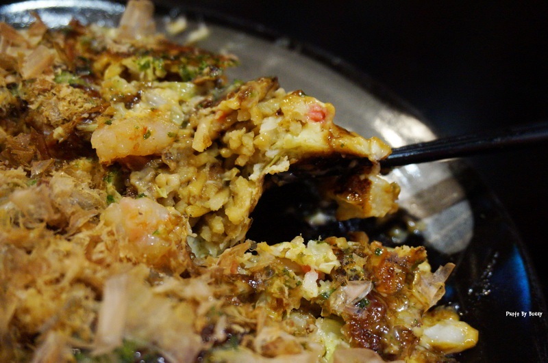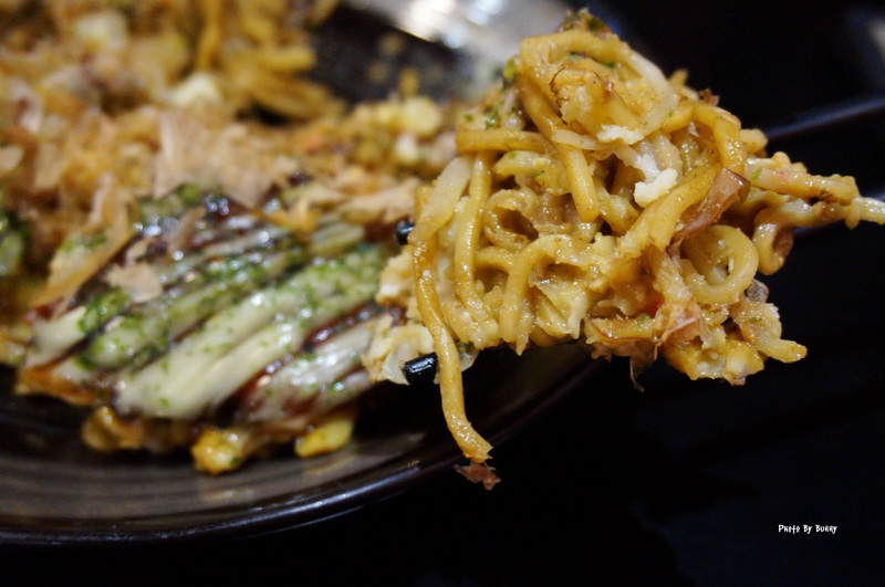 與大阪燒不同處在於裏頭夾著一層炒麵